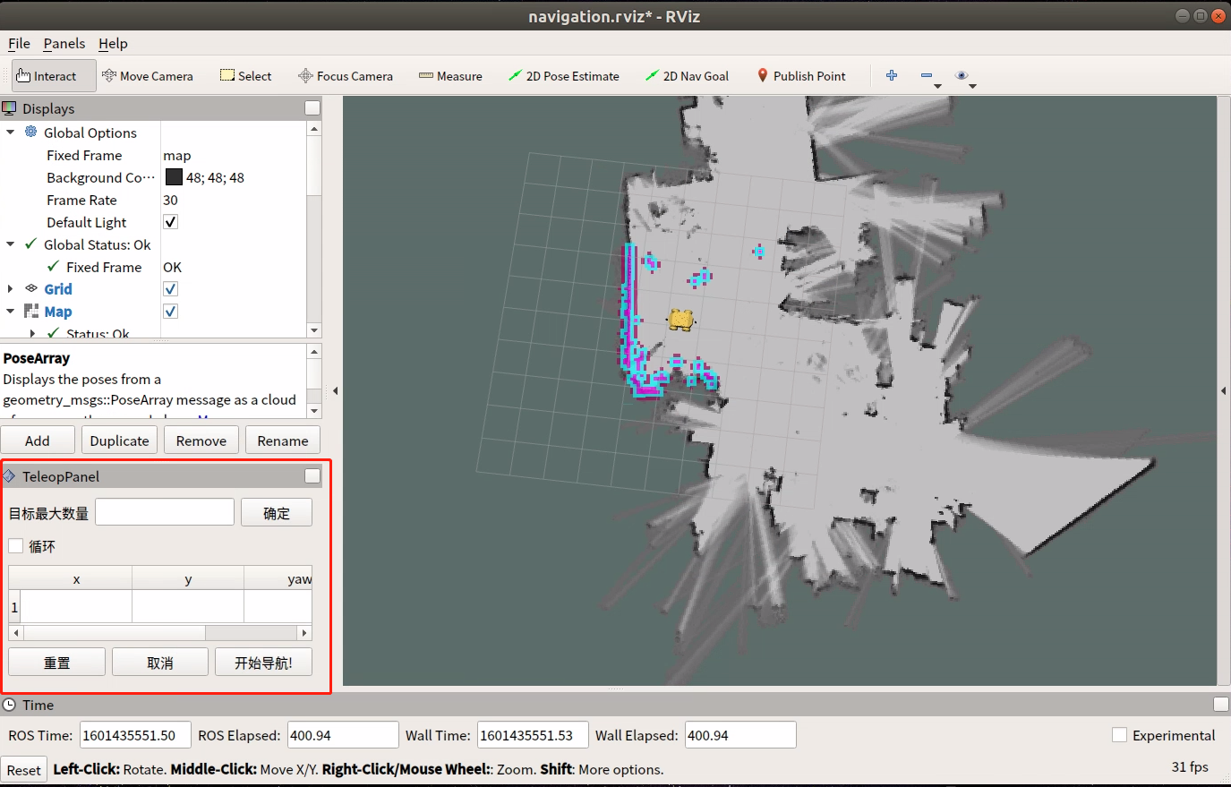 点击开始导航,打开 rviz使用键盘控制机器人运动当环境特征与地图匹配完成后机器人会定位到地图中对应的位置。
