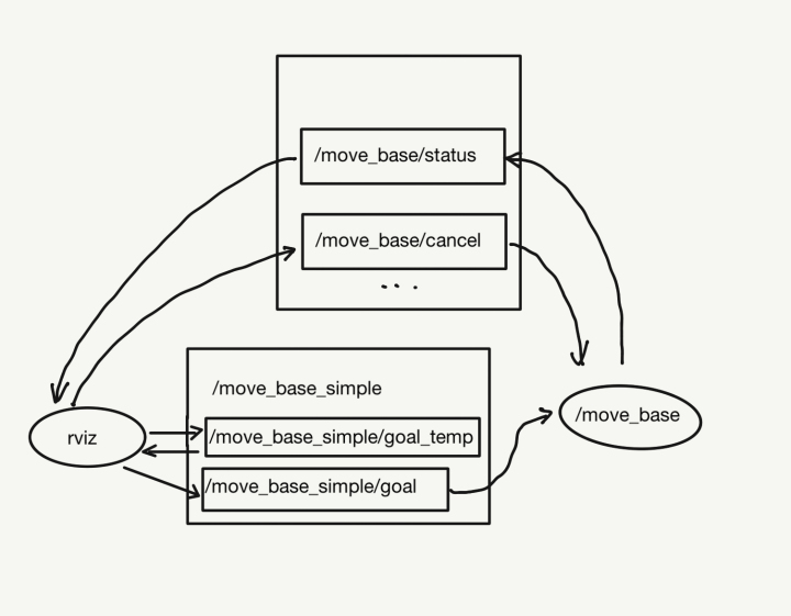 实现多点的方法有多种,在不打破 ROS Navigation 包的完整性的前提下我选择在2D Nav Goal的 RViz节点和 /move_base 节点中间添加了一个话题 /move_base_simple/goal_temp将原本发送给 /move_base_simple/goal 的消息,转发给/move_base_simple/goal_temp通过此话题来积攒多个 2D Nav Goal任务队列并根据任务完成的状态反馈按顺序将每个导航目标点消息 geometry_msgs/PoseStamped 再发送给话题/move_base_simple/goal以完成多任务中的单次目标点的导航如下图示